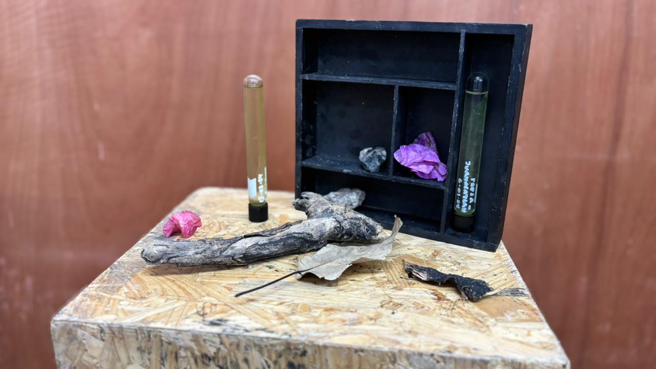 El segundo taller parece un gabinete de los que uno se imagina en historias antiguas: lupas, espejos, frascos, cajas de Petri, tubos de ensayo… una mesa llena de objetos que piden ser explorados.