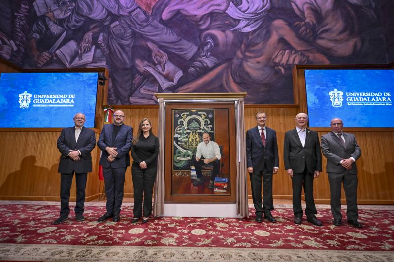 La Rectora General de la Universidad de Guadalajara, Karla Planter Pérez develó el óleo del ex Rector General, Ricardo Villanueva Lomelí, que quedará en pasillo de ex rectores del Paraninfo Enrique Díaz de León como un homenaje a los seis años de su administración, en el marco del centenario de refundación de esta Casa de Estudio.