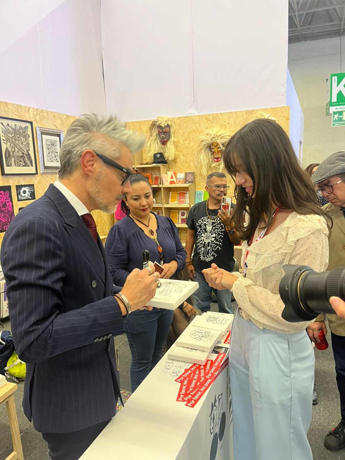 Fue allí donde viví uno de los momentos más inesperados de la jornada. Entre un mundo de gente, Daniel Gutiérrez, sí, el vocalista de La Gusana Ciega, pero también artista visual, estaba ahí conversando con calma, observando cómo la gente reaccionaba a su trabajo. Me acerqué con un cuadro de su autoría, una pieza que había adquirido por la fuerza inquieta que transmitía. Daniel lo tomó entre sus manos, lo miró un instante como reconociéndolo, y con una sonrisa cálida me firmó la esquina. Ese gesto íntimo, casi doméstico, convirtió la obra en algo más que un objeto artístico: se volvió una historia personal, una memoria anclada al espacio y al instante. Verlo firmar ahí, rodeado de máscaras, libros y colores, tenía algo de ritual improvisado.