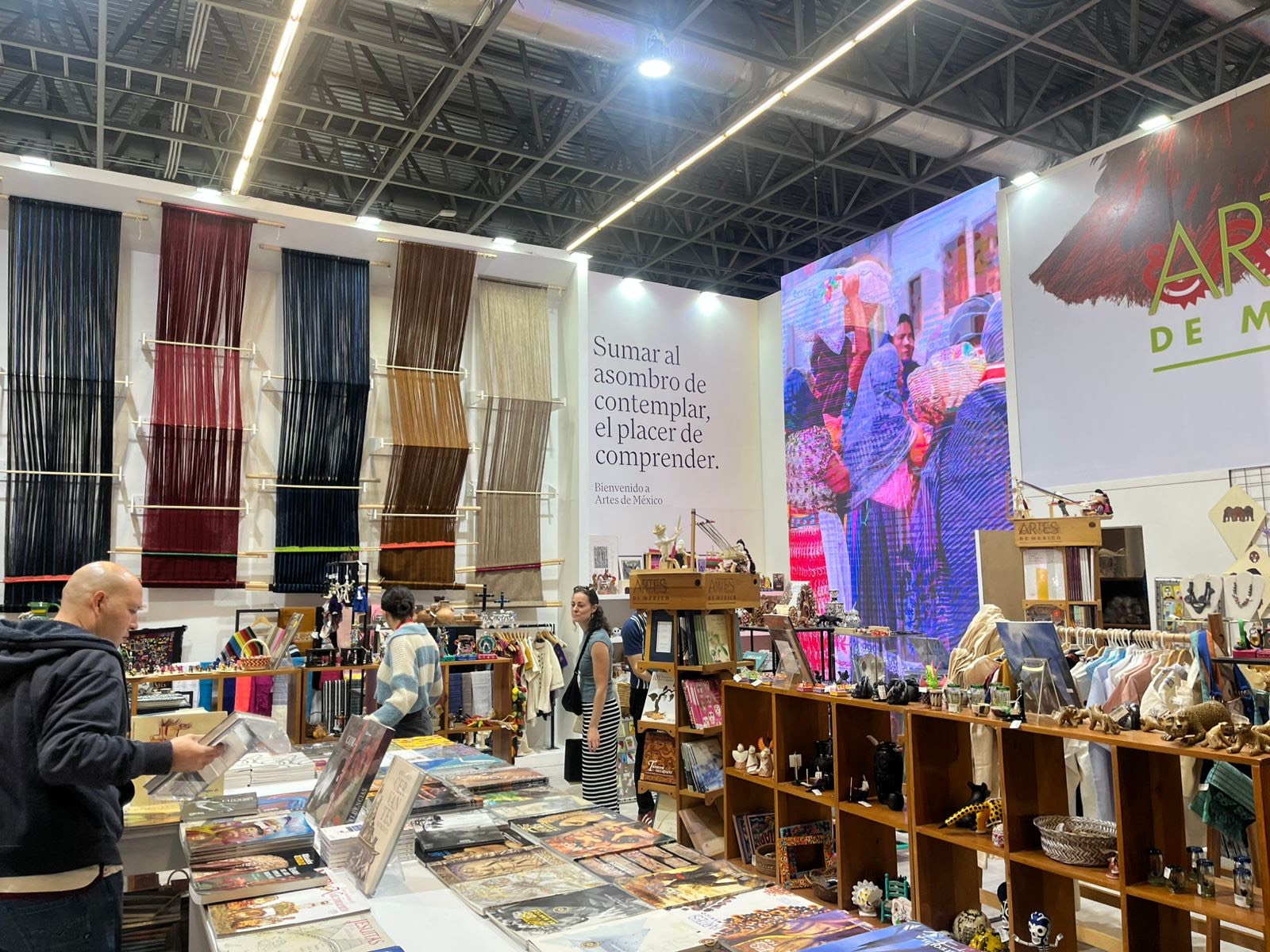 Más adelante, una estética maximalista, vibrante y muy “mexa” te hipnotiza con sus colores. Telares colgados, piezas textiles y artesanías de distintas regiones del país conforman el stand de Artes de México, que este año apuesta por mostrar la diversidad cultural desde la materialidad: fibras, tintes, manos y oficios convertidos en paisaje visual.