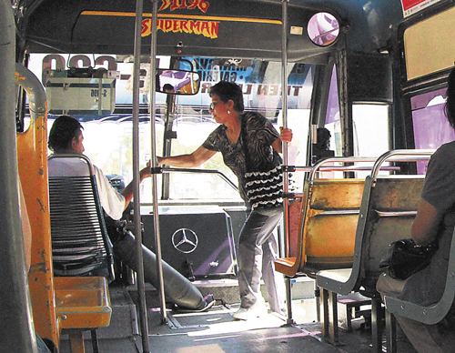 “De todo lo que se dice en la tele, nada es cierto, no tenemos seguro, no tenemos dónde ir al baño, no tenemos tiempo para comer, andamos siempre a presión, ganamos porcentaje, sin prestaciones. Trabajo jornadas de 24 horas, nos pagan con boletaje”, comenta Jaime Arias, operador de la ruta 142, quien aprovecha la luz roja de los semáforos para terminarse el lonche que era a la vez su desayuno y su comida.
